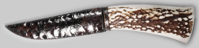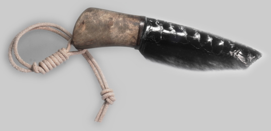| 1-47 ナイフ形石器 石刃技法により制作したナイフ ハンドルは白樺の瘤 サイズ 全長11.1㎝ 22,000円 |