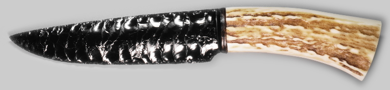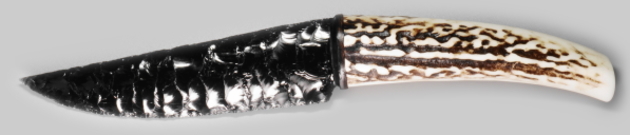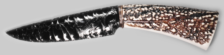 1-56 ブレードは黒曜石、ハンドルはエゾシカの角で、ハンドルの後部 に紐を通す穴をあけています。(アクセサリー用紐、ビーズ付属) 流木の台付 サイズ 全長9.7㎝ 15,400円 |