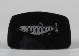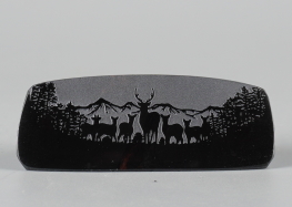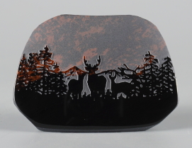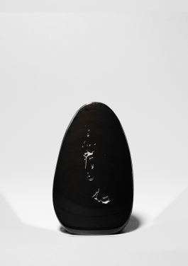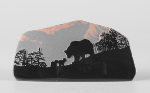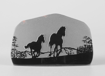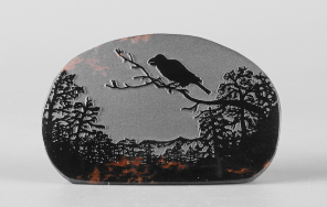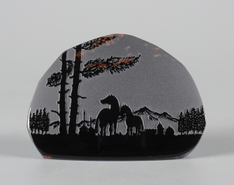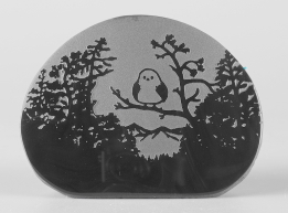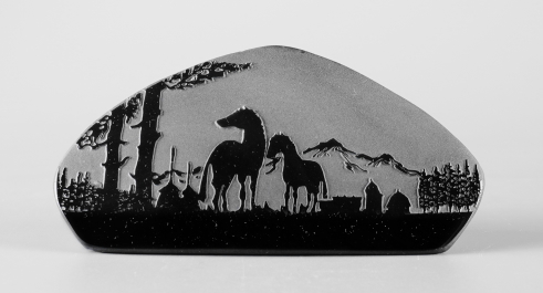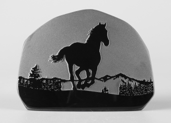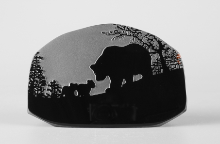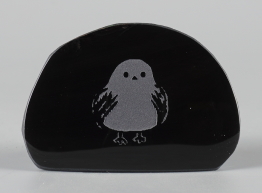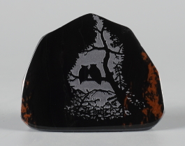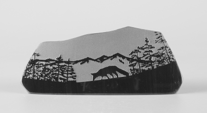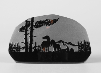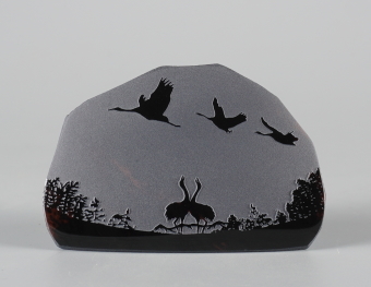 シルエットシリーズについて このシリーズの製作は石の平面加工から始まります。傷や不純物を除 きながら、約10工程の研磨により黒曜石本来の光沢を引き出し、出来 上がった石の形を見ながらどのような絵を彫刻するか決め仕上げていき ます。黒が基本ですが、時には赤や茶の模様が夕焼けのように彩りを 添えてくれることがあります。 白っぽく見える部分が彫ってあります。 |