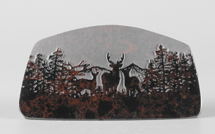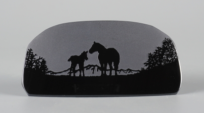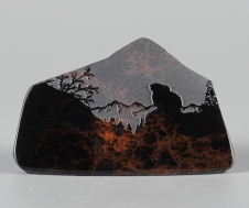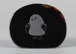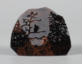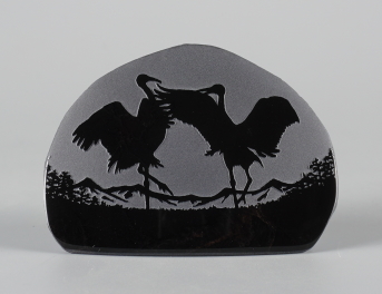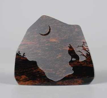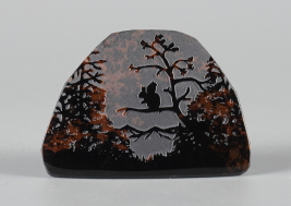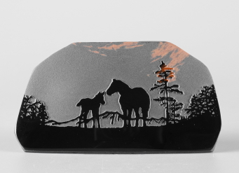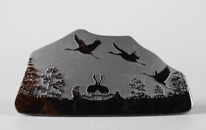 シルエットシリーズについて このシリーズの製作は石の平面加工から始まります。傷や不純物を除 きながら、約10工程の研磨により黒曜石本来の光沢を引き出し、出来 上がった石の形を見ながらどのような絵を彫刻するか決め仕上げていき ます。黒が基本ですが、時には赤や茶の模様が夕焼けのように彩りを 添えてくれることがあります。 白っぽく見える部分が彫ってあります。 |
