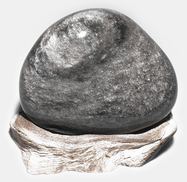 | 9-23 表裏ともに銀色の色光が見られたので原石の形状のままに全面研磨しました。 ※表面中央部に長さ1㎝程の線状のキズがあります 流木の台付 (この台は多様な石の置き方に対応します) サイズ 横幅9.1×奥行4.5×高さ7.5㎝ 38,500円 |