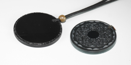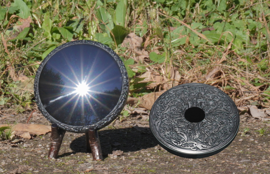 | 9-60 黒曜石の鏡に、初秋の朝陽を映しました 裏面の彫刻は縄文風模様、鏡面は緩やかな凸面です サイズ 直径8.83×最大厚1.3㎝ 小枝の台付 31,900円 |